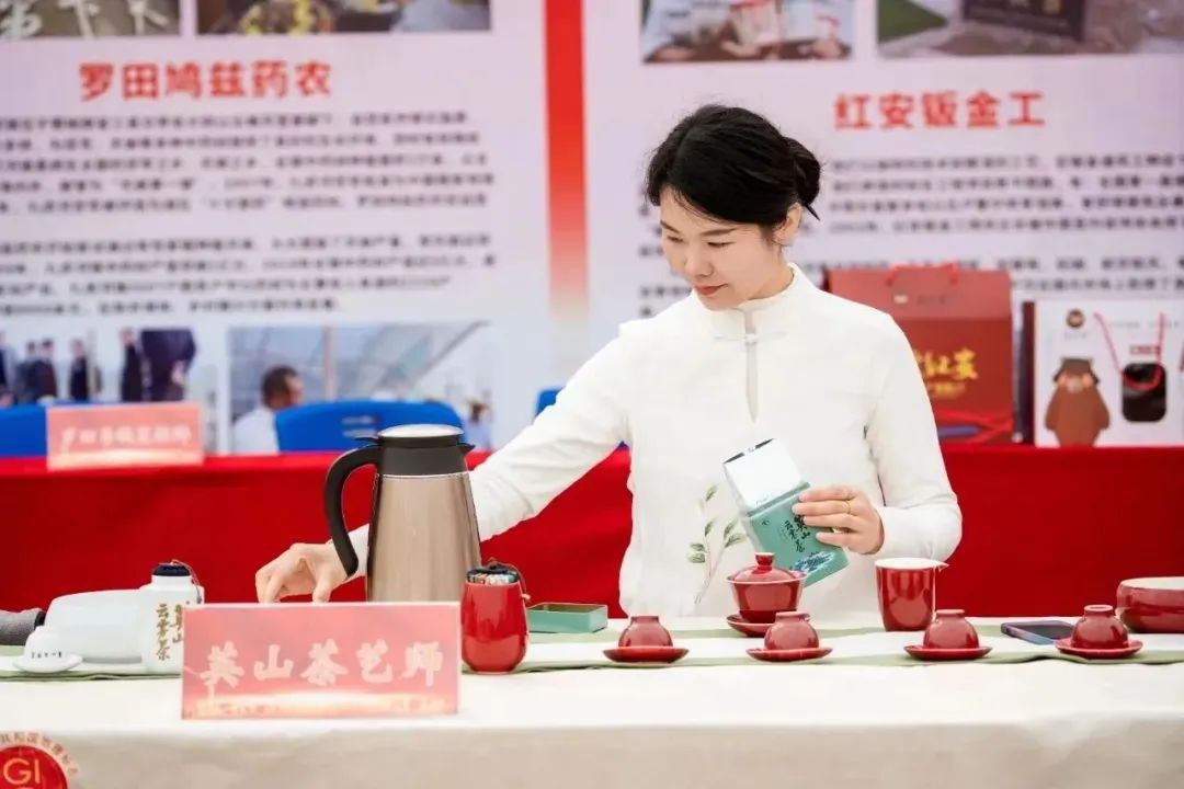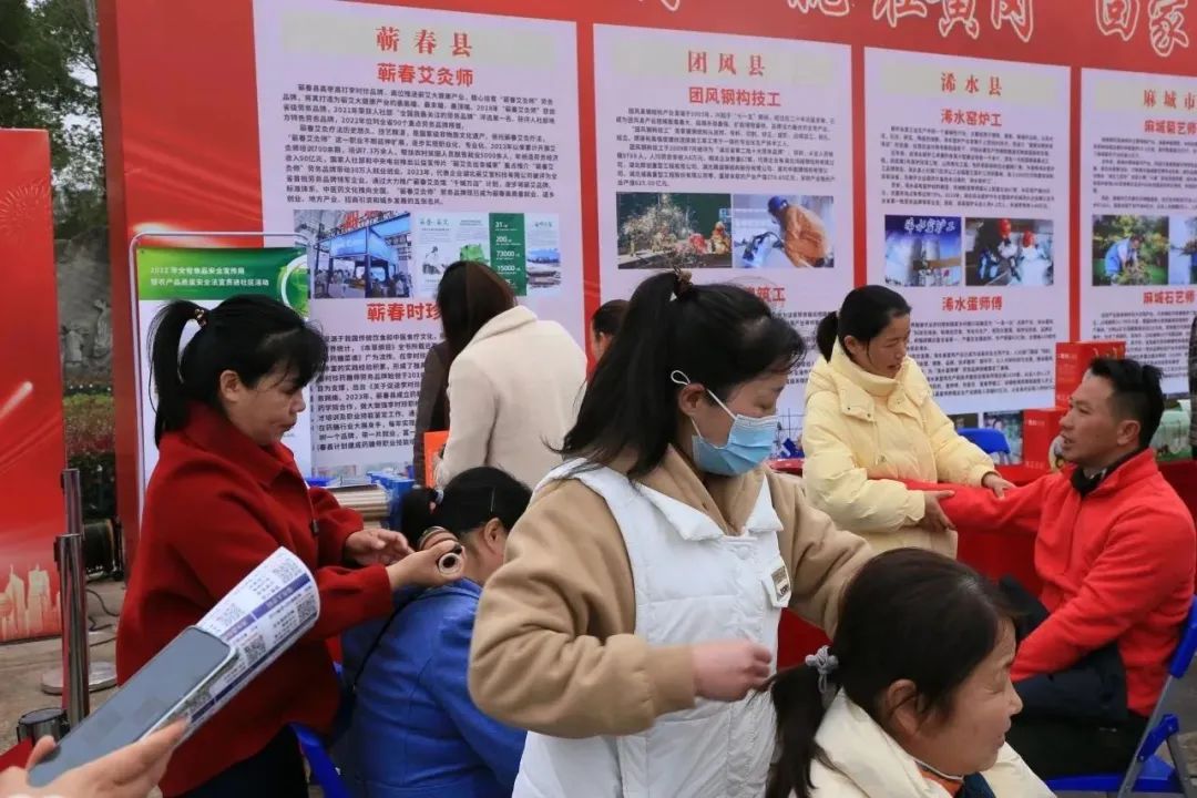劳务品牌展示区。蕲春艾灸师、浠水蛋师傅、罗田吊锅烹饪师等9个劳务品牌齐齐上阵,通过展板宣传、产品展示、现场展演、服务体验等方式展示各地区域风采。